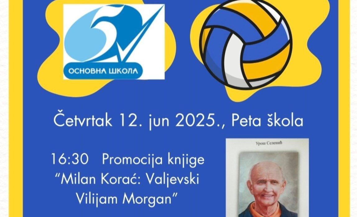 На слици може бити: 1 особа, игра кошарку, игра одбојку и текст који гласи „MEMORIJALNI ODBOJKAŠKI TURNIR SUSRET GENERACIJA OCHOBHA OCHOBHAWKOлa WKOЛA Četvrtak 12. jun 2025., Peta škola ypexu esuah 16:30 Promocija knjige "Milan Korać: Valjevski Vilijam Morgan" 17:00 Odbojkaški turnir didcsne MИЛAH MИЛAHKOpaT: KOPAЛ: BAЛEBCKИ BИЛиAm MOPrAH Poziv važi za sve rekreativce, ljubitelje odbojke, bivše uč učenike, poštovaoce lika dela nastavnika Koraća... Turnir je u mix kategoriji (3 muškarca, 3 žene)“