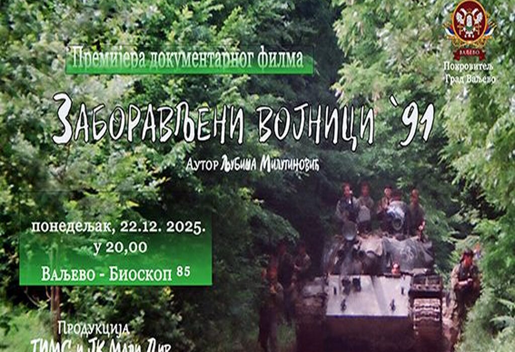 Dokumentarni film „Zaboravljeni vojnici ’91“, autora Ljubiše Milutinovića biće prikazan u Bioskopu 85 u ponedeljak 22 decembra. Pomenuti film donosi potresno i objedinjeno svedočenje o stradanju i pogibiji dvadeset i jednog pripadnika Jugoslovenske narodne armije, rođenjem i poreklom sa teritorije valjevske opštine.