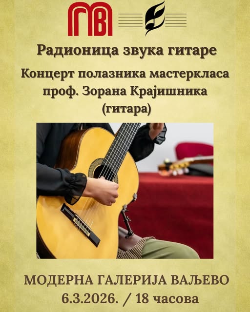 U petak, 6. marta, sa početkom u 18 časova, SMŠ Živorad Grbić poziva sve ljubitelje muzike na koncert polaznika masterklasa prof. Zorana Krajišnika, koji se održava u okviru Radionice zvuka gitare.