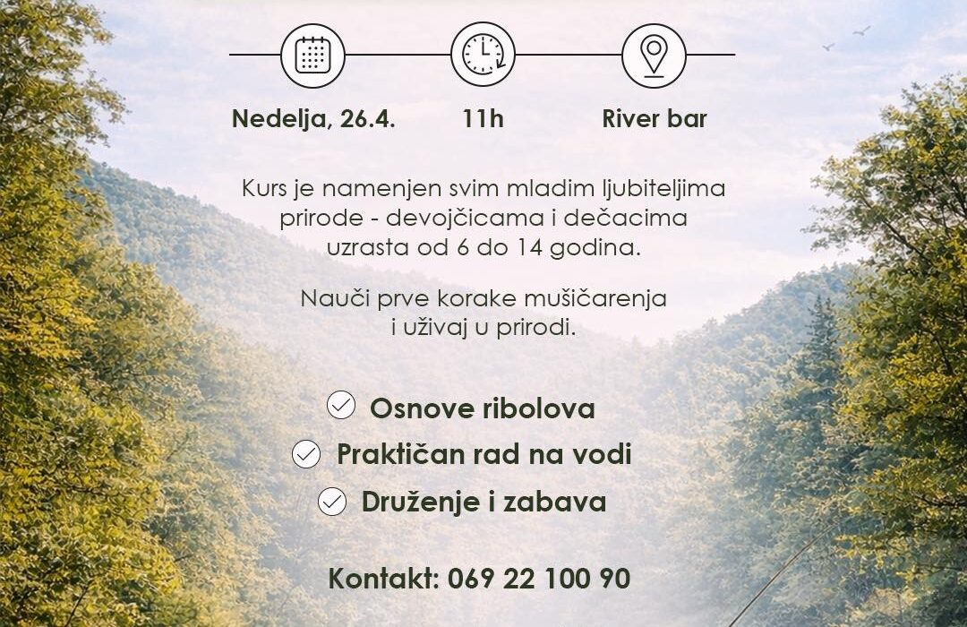 U nedelju, 26. aprila, sa početkom u 11 časova, na reci Gradac, kod River bara, biće organizovan besplatan kurs mušičarenja namenjen deci i mladima uzrasta od 6 do 14 godina. nnCilj ovog kursa je da se najmlađi upoznaju sa osnovama ribolova, kao i da kroz praktičan rad na vodi steknu svoja prva iskustva u mušičarenju. Ovaj događaj pruža priliku za boravak u prirodi i druženje sa vršnjacima.