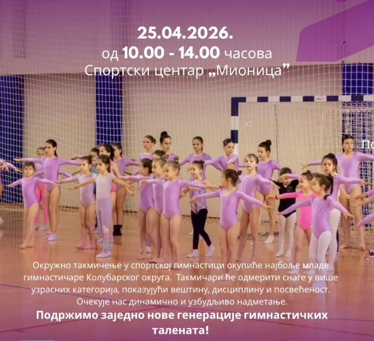 Kolubarsko okružno takmičenje u sportskoj gimnastici za decu mlađeg školskog uzrasta, uzrasta od 6 do 14 godina, pod nazivom „Gymnastics Open Mionica“, održaće se u subotu, 25. aprila, od 10 do 14 časova, u Sportskom centru u Mionici.