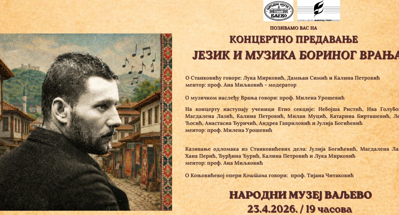 Koncertno predavanje „Jezik i muzika Borinog Vranja”, u organizaciji Muzičke škole „Živorad Grbić”, održaće se u četvrtak, 23. aprila, sa početkom u 19 časova u Narodnom muzeju. Ovaj program se realizuje povodom obeležavanja 150. godišnjice rođenja Bore Stankovića, sa ciljem da se kroz interdisciplinarni pristup osvetli umetnički svet ovog značajnog pisca i njegova duboka povezanost sa muzičkom tradicijom.