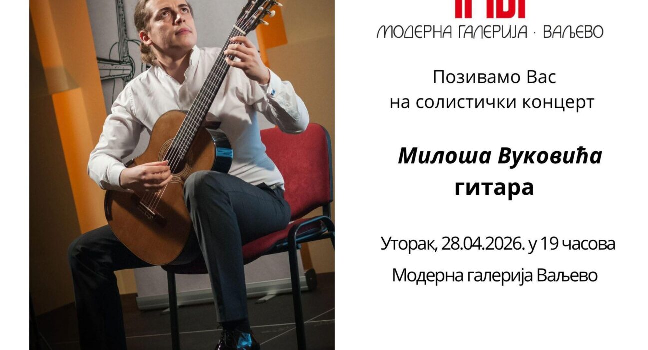 U utorak, 28. aprila 2026. godine sa početkom u 19 časova, u Modernoj galeriji Valjevo biće održan solistički koncert gitariste Miloša Vukovića. Očekuje vas pažljivo odabran program koji ističe lepotu i izražajnost klasične gitare, u intimnom i inspirativnom prostoru galerije. Dobro došli da zajedno podelimo muzički doživljaj.